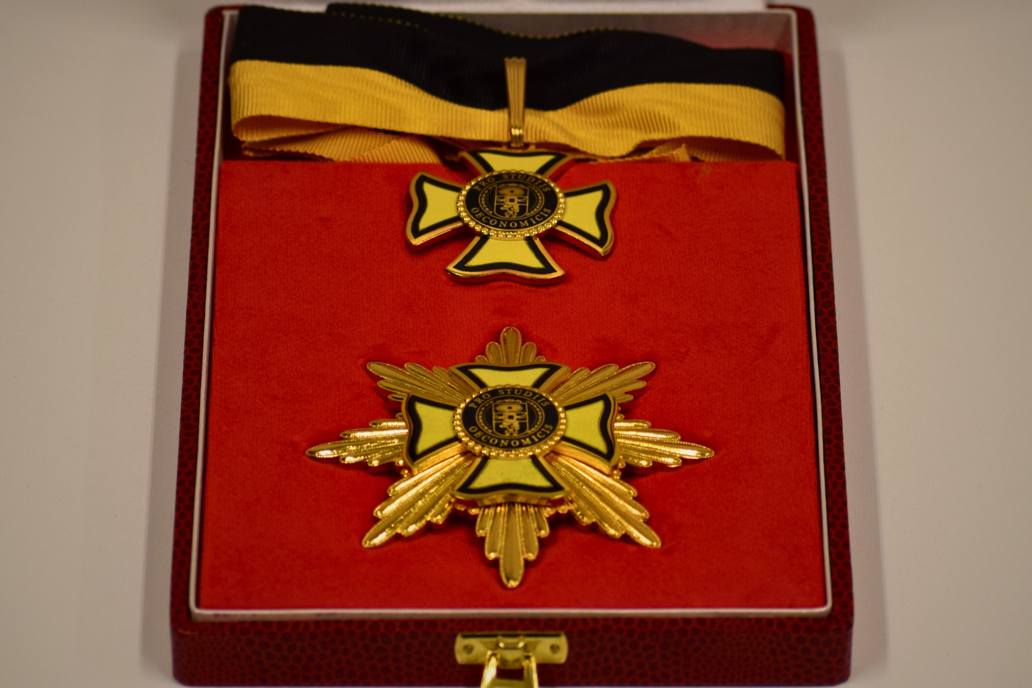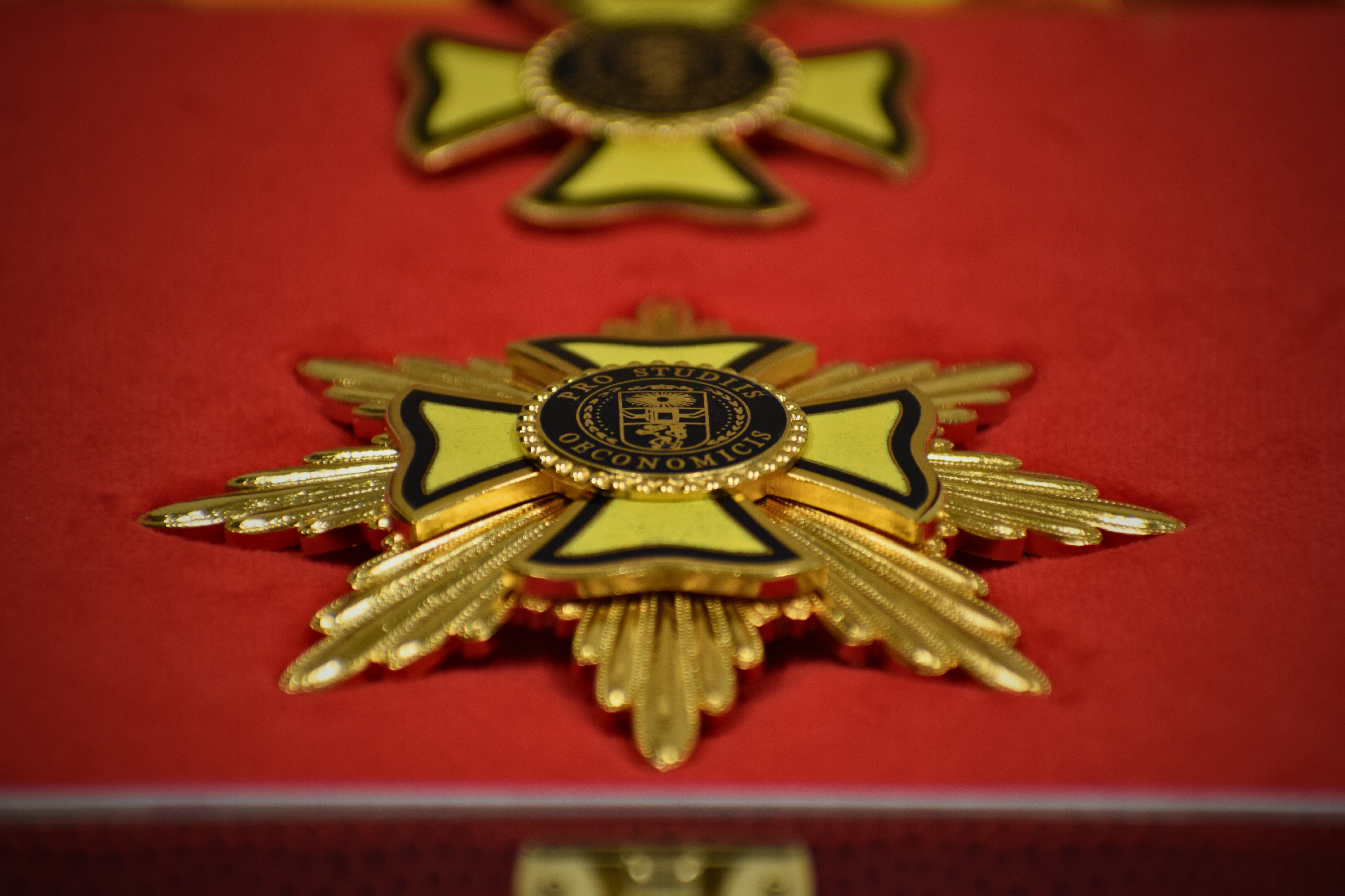 Das Ordenskreuz stellt das vierstrahlige Maria Theresien-Kreuz dar, mit gelb-schwarz breiter Metallbordierung. Die Farbe Gelb ist feueremailliert und erhält dadurch seinen außergewöhnlichen Charakter. Oben versehen mit Öse, Collant und einem 45 mm breitem Halsband mit gelb, schwarzem Bändchen. Im Mittelfeld des Ordens ist eine Auflage montiert mit Darstellung des Universitätswappens, welches eine schwarz-Metall Verzierungen aufweist, umgeben ist von schwarzem Rand, mit der Inschrift: "PRO STUDIIS OECONOMICIS". Versehen ist der äußere Rand der Auflage mit einem Perlenrand, gefertigt in Metall. Der brillantierte Eindruck des Perlenrandes entsteht dadurch, dass jede einzelne Perle von Hand aus gestochen und platziert wird. Der Orden ist vergoldet.